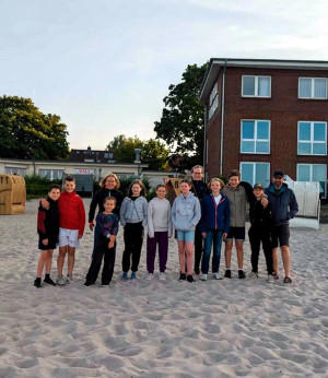 Am Freitag, den 13. fuhren wir los nach Eckernförde. Doch ohne die tollen und hilfsbereiten Eltern hätten wir dort gar nicht hinfahren können, da der Sprinter, der uns dort hin transportieren sollte, ein paar Tage zuvor seinen Geist aufgab. Die Fahrt verlief gut, und wir kamen alle schnell durch. Als wir ankamen, erwartete uns die tolle Überraschung, dass die meisten von uns nicht auf Luftmatratzen, wie letztes Jahr, sondern in schönen weichen Betten schlafen durften. Nachdem wir am Abend gegessen hatten und unsere Sachen einsortiert hatten, sind wir nochmal zum Strand gegangen und haben die Lage gecheckt. Die Wellen waren ziemlich hoch und uns war ein bisschen mulmig zumute, da wir nur im Teufelssee geübt hatten und das Wasser nicht zu vergleichen war. Doch nach ein paar Runden Beachflags sind wir zurück in die Unterkunft gegangen und haben uns schnell in die Betten gelegt, damit wir fit für den Wettkampftag waren.